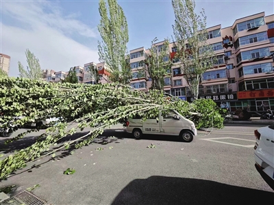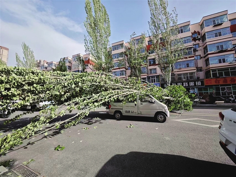 下午4时许,永乐北街南侧的一棵大树也被大风吹倒。目击者介绍,当时的风很大,这棵杨树突然向北侧倒下,一辆正常行驶的汽车被压,车顶变形。受倾倒的大树影响,永乐北街双向交通中断。随后,相关部门赶到现场,对倒伏大树进行了处理。