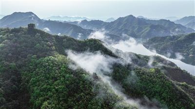 当日,雨后的河北省迁西县境内的古长城附近水气升腾、云雾缭绕,古长城在云海中若隐若现,美景如画。 新华社 发