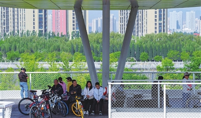 5月2日,市民在滨河自行车道驿站休憩赏景。“五一”小长假期间,越来越多市民选择骑行出游,欣赏并州美景,享受假日美好。 牛晨阳 摄