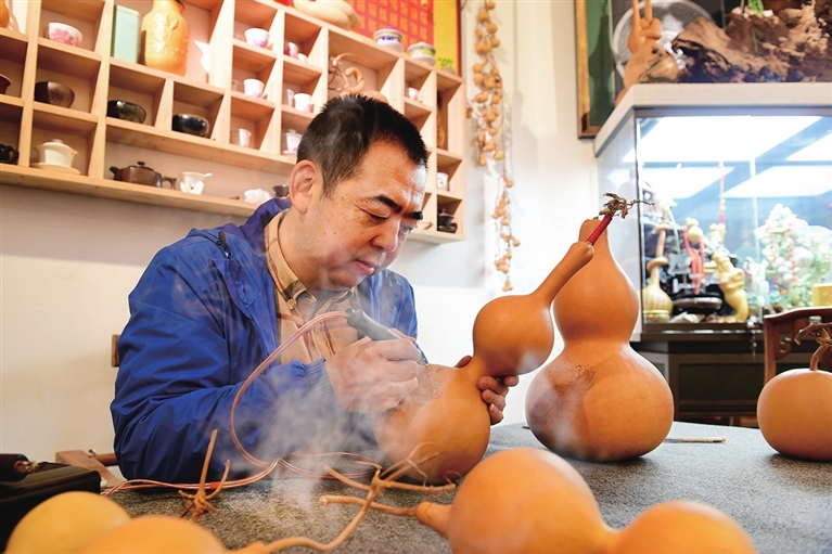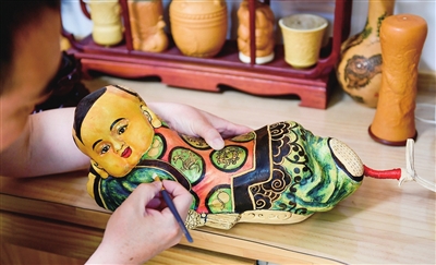 葫芦彩雕选用干透的适合图案造型的葫芦进行构图,运用浮雕、镂雕、浅浮雕、阴阳雕等工艺进行刻制。最后是上色、打磨、抛光……寻常的葫芦,在艺人手中变成了拙朴自然、高雅精美的艺术品。