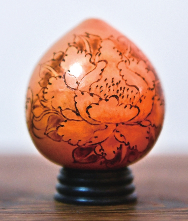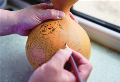 葫芦烙画工艺历史悠久,是传统手工艺的代表之一。匠人以葫芦为载体,以烙刻为手段,辅以针刻、彩绘、镂空、浮雕等工艺,注重“意在笔先、落笔成形”,突出“以铁为笔,以火为墨”的艺术特征。运用勾、勒、点、染、擦、白描等手法,烙出丰富的层次与色调,保持了中国传统绘画的民族风格。