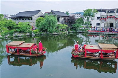 当日,浙江省建德市梅城镇严州古城举行宋韵水上婚礼表演,通过出阁、梳妆、登船、亲迎、礼拜的五幕演绎,吸引了人们驻足观礼。有着1000多年历史的严州古城地处新安江、富春江、兰江交汇处,历史文化积淀深厚。