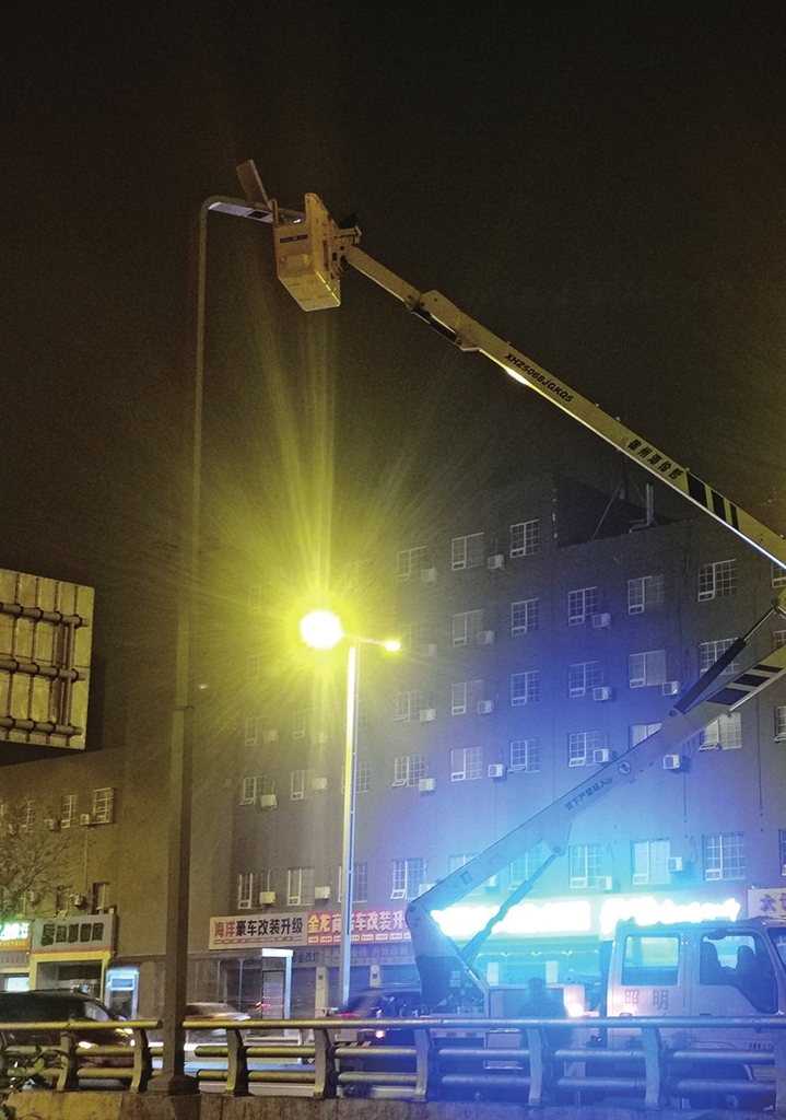 5月7日晚,太原市城市照明管理中心的工作人员对建设南路上照明设施进行维护保养,更换老化灯泡,确保市民夜间安全出行。 牛利敏 摄