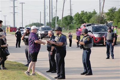 5月6日,警察在美国得克萨斯州达拉斯近郊发生枪击事件的购物中心附近和目击者交谈。