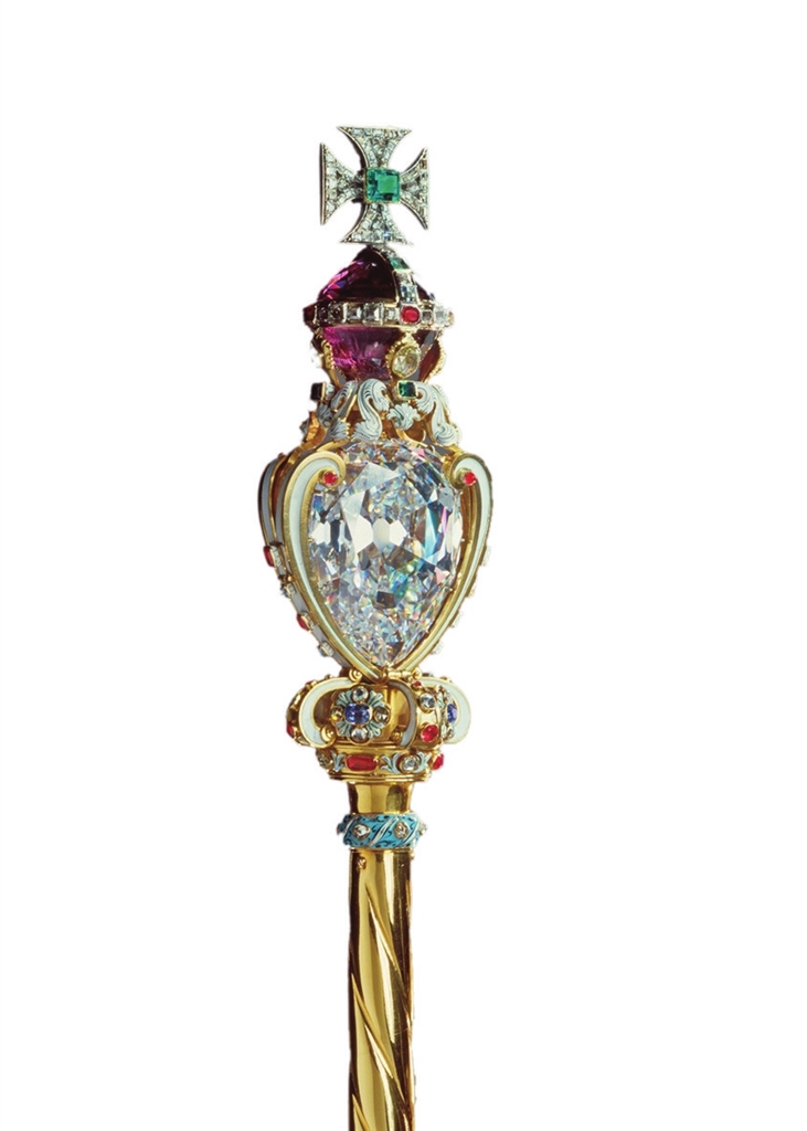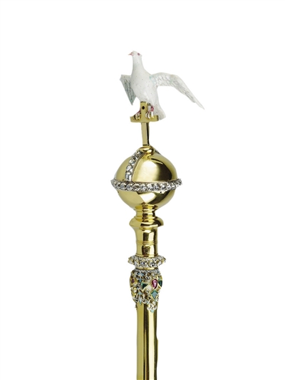除此之外,两根君主的权杖也在查尔斯的加冕典礼上出现。君主的十字权杖制作于1661年,代表世俗权威,并与善政有关。多年来,它经历了一些转变——最引人注目的是加入了库里南一世钻石,这颗钻石重达530克拉,自1911年以来一直装饰在金杖的顶部。同时,君主的鸽子权杖也出现,它也被称为“公平和仁慈之杖”,象征着精神权威,其搪瓷鸟代表圣灵。