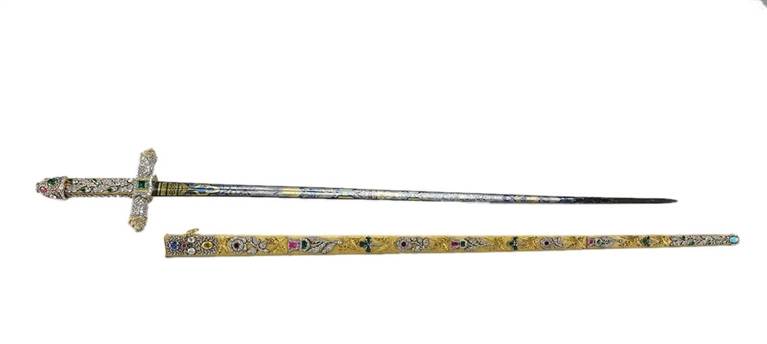 另一件令人惊叹的作品——奉献之剑也出现在典礼上,它制作于1820年,首次使用是在乔治四世国王的加冕典礼上。它有一个钢制的剑身,镶嵌了祖母绿、红宝石、蓝宝石和钻石,构成了玫瑰、蓟草、三叶草、橡树叶、橡子和狮子头的图案。这把剑被装在一个精致的皮革剑鞘中。奉献之剑是骑士美德的代表,由坎特伯雷大主教祝福,交付给国王,然后在祭坛上献上。