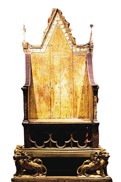 加冕椅也被称为圣爱德宝座。它由波罗的海橡木制成,宝座原为涂金,四周均有绘画。背面画有英格兰国王忏悔者爱德华(1042年至1066年在位)或爱德华一世的全身画像,画中人物双脚站在底座的涂金狮子上。经过岁月的洗礼,除了背面和两侧下方还仅存有一些树叶、鸟类和动物图案,大部分的涂金早已褪去,精美的绘画也几乎无存。
