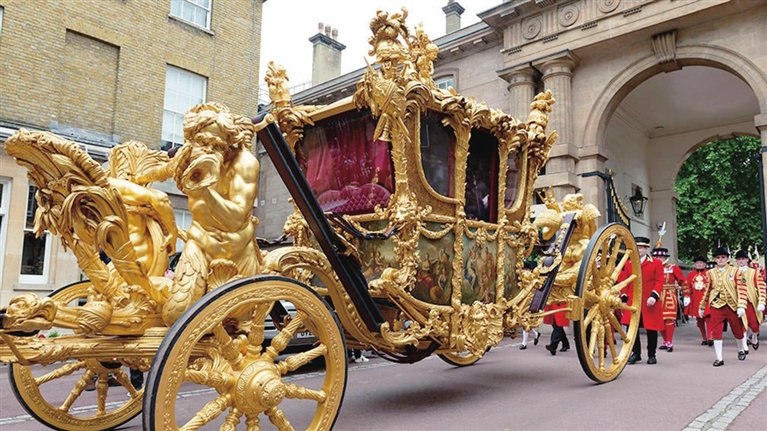 加冕仪式后,国王与王后乘坐另一辆黄金国家马车返回白金汉宫。黄金国家马车建造于1762年,自1831年英国国王威廉四世加冕以来,这辆马车就被用于之后的每次加冕仪式。这辆有着近300年历史的马车长7米,高3.6米,重4吨,只能以步行的速度移动,“这也增加了这次皇家游行的庄严”。古德西尔解释,“毕竟很少能有君主制国家将18世纪的马车保留至今。”