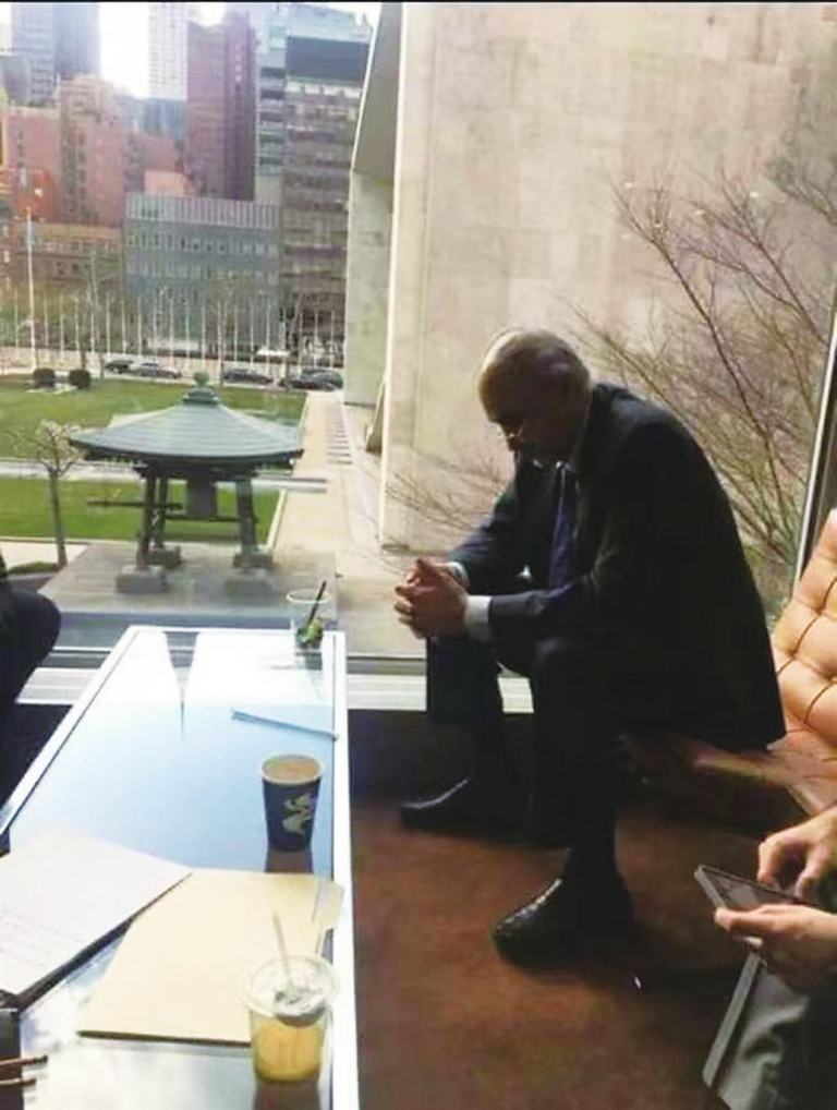时任叙利亚常驻联合国代表巴沙尔·贾法里曾不止一次在联合国会议上痛诉美国等国污蔑叙利亚政府,而美方对此充耳不闻,继续肆意对叙进行制裁和军事打击。曾有一张贾法里坐在联合国总部大楼休息区的照片在网上广为流传:身形高大、西装革履的他低着头,背稍屈,双手交握,身影中透出疲惫。在他身旁的窗外,楼下一座亭子里悬挂着“和平钟”。