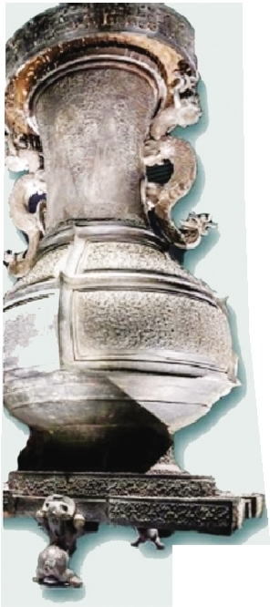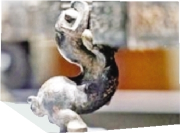 据夏女士介绍,承托这两个大壶的铜禁为长方形,禁的长边由4只小兽支撑,小兽的口和前足衔托着禁面,后足蹬地,腰身呈优美曲线,“其形象小巧玲珑,与体积大的禁面和铜壶形成了强烈对比。”