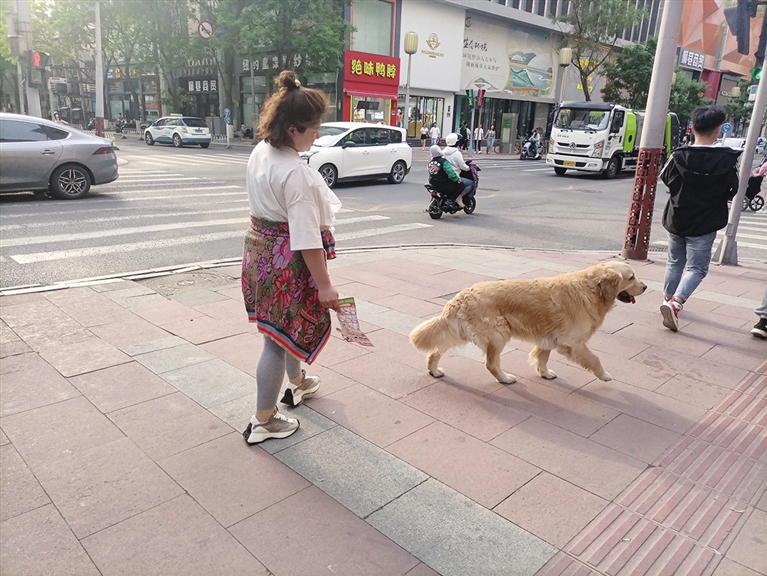 5月8日17时,在柳巷街头出现这样一幕:路上行人很多,一名女子在人行便道上遛狗,却没有拴绳。体形较大的金毛犬在前面走,主人跟在后面。有怕狗的小孩见到,慌忙躲到一旁。《中华人民共和国动物防疫法》明确规定:携带犬只出户的,应当按照规定佩戴犬牌并采取系犬绳等措施。在此,提醒大家要文明养狗,不要给他人造成困扰。