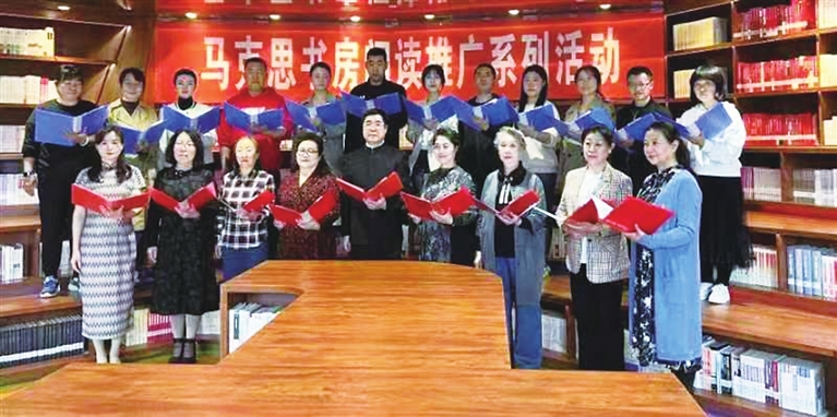 5月10日下午,兴华街道滨河社区联合太原开放大学在太原市图书馆马克思书屋开展“重温马克思经典 讴歌青春中国”主题党日活动。活动中,21名太原开放大学党员、朗诵班的学员以及社区志愿者、朗诵爱好者,以铿锵有力的气势和饱满的感情吟诵了诗歌《青春中国》,忆历史峥嵘,续红色血脉。