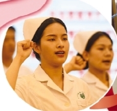5月10日,在广西南宁市第四人民医院,黄小贤(前)和同事在医院庆祝国际护士节活动中进行新入职护士宣誓。