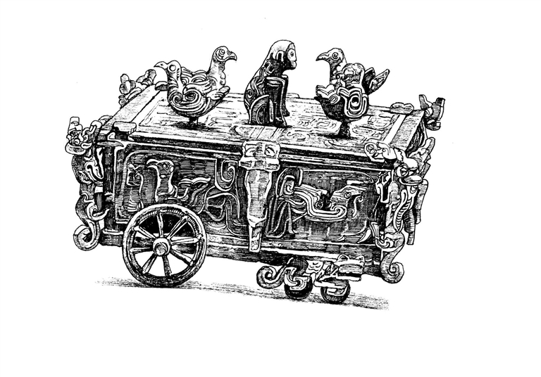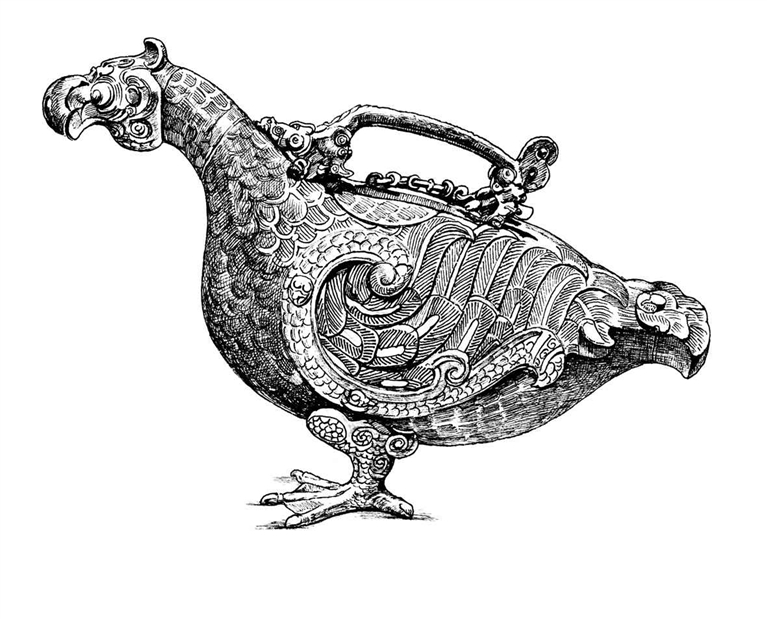 赵卿鸟尊出土于赵卿墓。鸟羽迎风飞舞的动态,将地纹与高浮雕的翅纹有机结合,使静中有动,加上前倾的动姿,使鸟既似刚刚收羽落地,又似在等待振翅飞翔,真实地反映出两周时期晋式青铜器清新唯美的风格。
