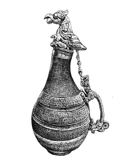 此物1988年出土于太原市金胜村赵卿墓,吸睛处有三:一是歪口壶身,二是壶盖张口之鸟,三是壶把衔环之虎,三者均有张扬不羁之状,集于一体,其独特更引人近观,以探究竟。