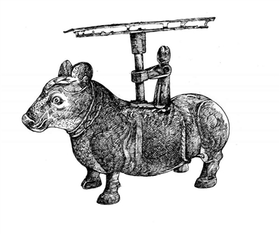 此盘1965年出土于山西长治地区。站在神兽背上的是一名女子,举着一个镂空的圆盘。神兽神态乖萌,女子虽小,但衣纹清晰,发丝可辨。圆盘可以转动,圆柱可拆卸,着实令人称奇。