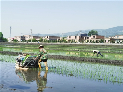 当天上午天气晴朗,微风阵阵,正是农事好时节。连绵的青山、错落有致的农舍映衬着辽阔的水稻田。戴着草帽的农民将一卷卷水稻秧苗放入智能插秧机,插秧机所到之处,一排排秧苗整齐栽种。