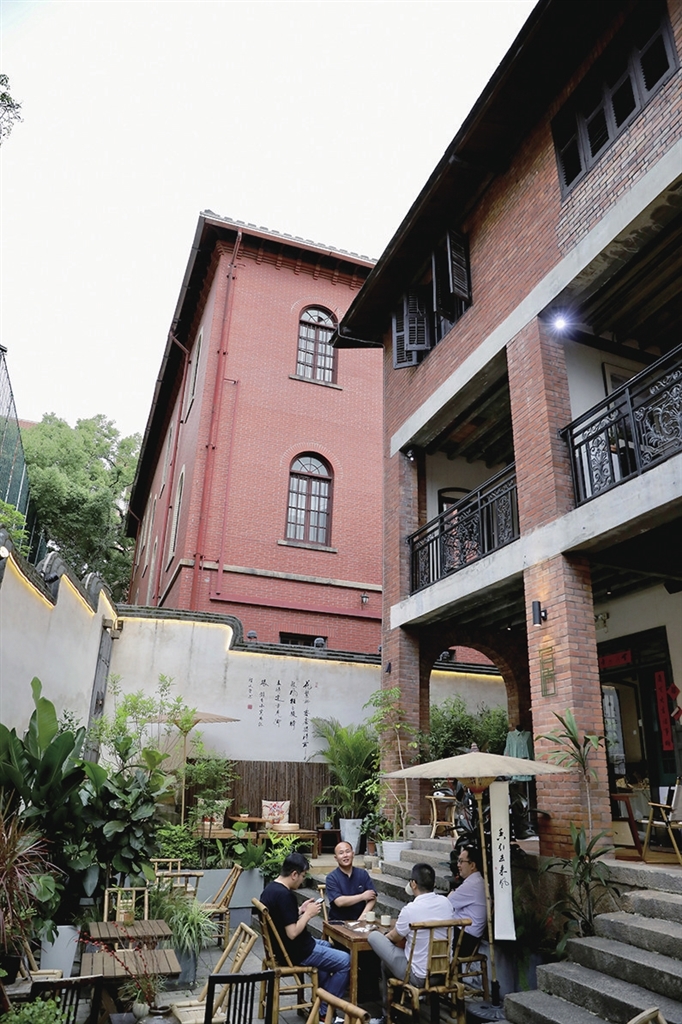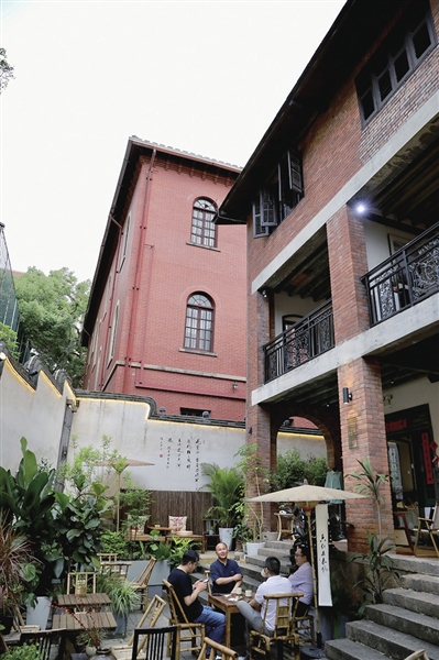 游客在福州烟台山历史风貌区古厝咖啡馆内休闲。