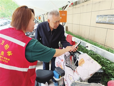 小区环境变得干净整洁,对物业来说管理起来更加方便,居民也都自觉维护。院子里,83岁的赵大爷专门找来网格员胡晓娜,向她请教如何在手机上操作智能充电桩。老人不骑车,学会充电,纯粹为了子女。孩子下班晚,有时偷懒就随手把车子停到了单元楼门口。老人见了,就把车子推进车棚,扫码充上电。长辈的实际行动,很快让子女有所感悟,也一改之前的做法,一回家就把车子停到了车棚里。
