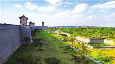 天空蔚蓝,白云飘飘,古城巍峨,绿地葱茏。太原古县城一派赏心悦目的好风光。