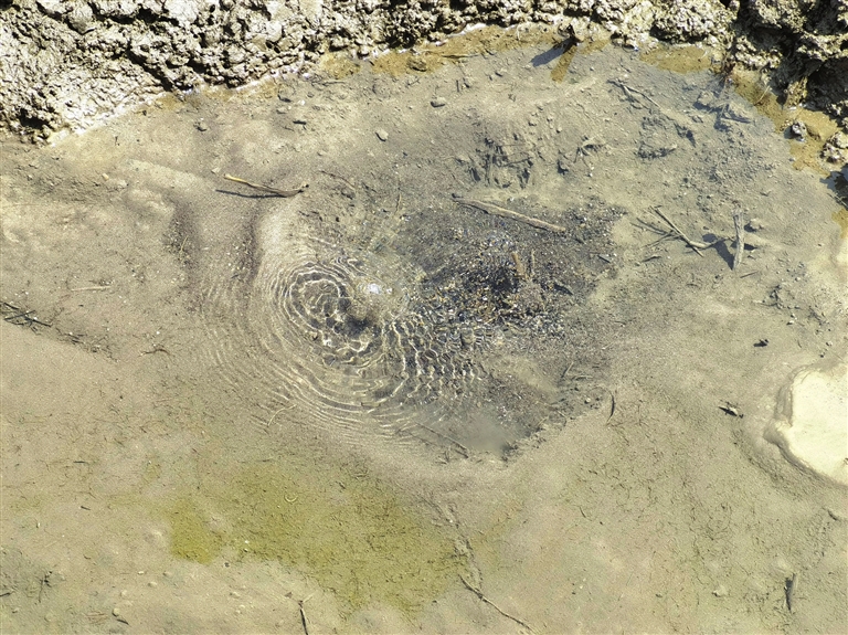 “不止这一个地方有泉眼!”郭仁静带路,绕到北侧一处稻田里。靠近田垄的田地里,一汪泉水往北不断蔓延。细细看去,活水下方有两个泉眼不住地往外“咕嘟嘟”冒水。在黑土地的映衬下,泉水显得格外清冽。蜿蜒而出的水流出几百米开外。