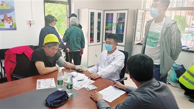 城市建设离不开建筑工人的辛勤付出。5月22日上午,太铁二社区邀请驻地医院的医护人员走进辖区太原建工集团有限公司的一处工地,为工友们进行免费体检和义诊,受到大家好评。 韩睿 陈芳英 摄