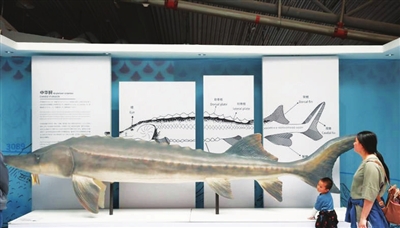 5月24日,长江主题科普展“大江行地——多姿多彩的长江生命”(南京站)在南京科技馆开幕。图为展出的长江珍稀鱼类中华鲟模型。