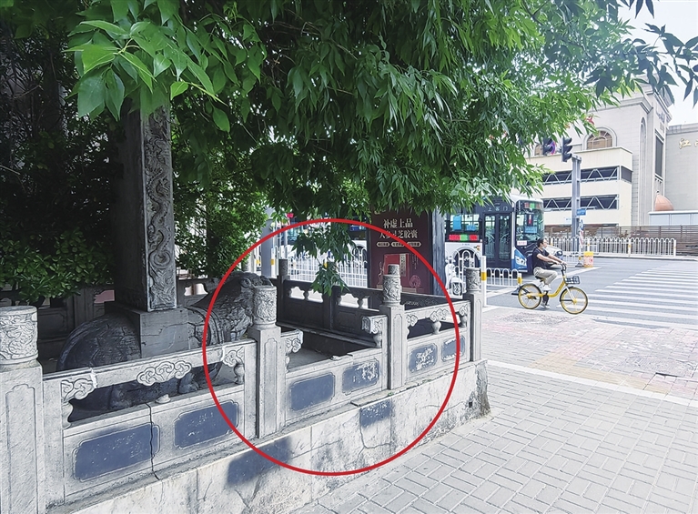 5月25日,记者在北肖墙与新民中街交叉口东北角便道上看到,石碑西侧围栏有一截断裂,出现缺口影响美观,希望相关部门尽快维修。