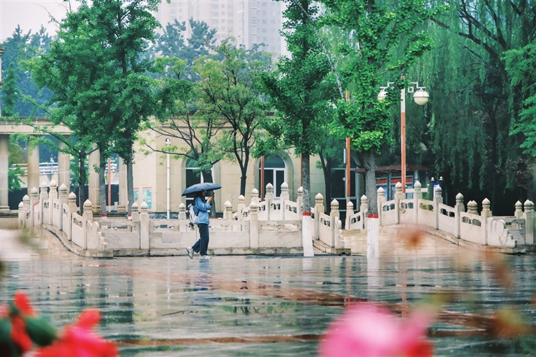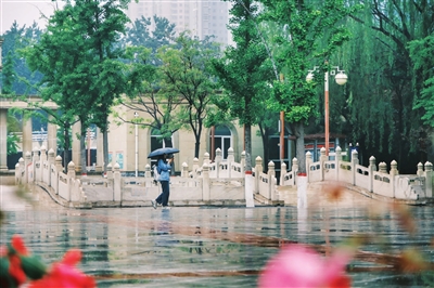 5月27日,市民在学府公园散步,享受雨天的凉爽。市气象台提醒,预计未来三天,我市将出现持续降雨,市民外出需带好雨具。 王韵菲 摄