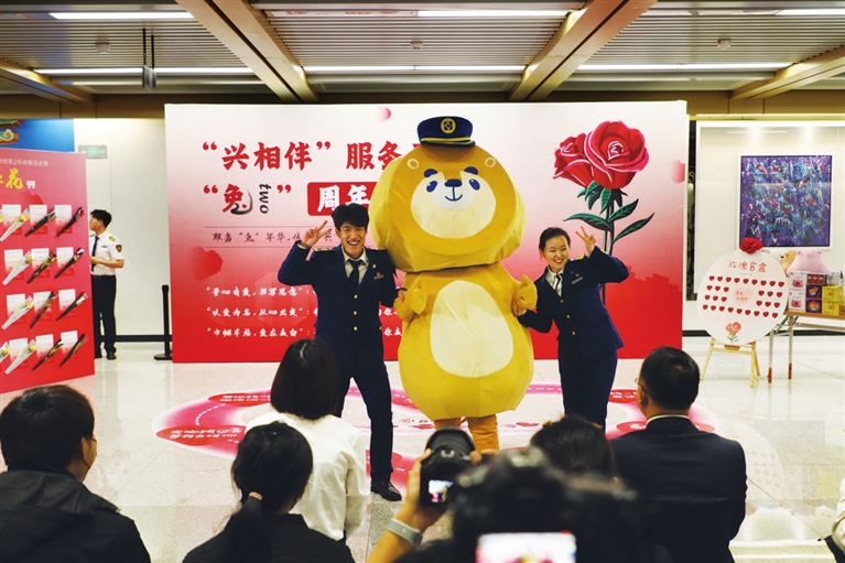 5月26日,太原中铁轨道交通建设运营有限公司在地铁2号线大南门站举行“兴相伴”服务品牌2周年纪念活动。活动中,地铁工作人员表演礼仪操、情景剧、工装秀等节目,让更多市民了解太原地铁。 张昊宇 摄