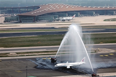 2023年5月28日12点31分,东方航空MU9191航班平稳降落在北京首都国际机场,穿过象征民航最高礼仪的“水门”,受到现场热烈欢呼。