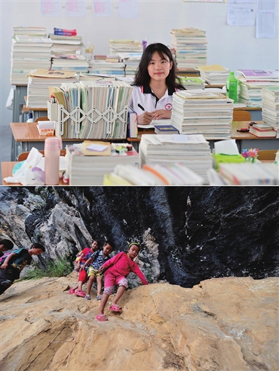 上图:2023年5月20日,蒙俐谷在大化瑶族自治县第二中学高二年级教室里学习;一年后将参加高考的蒙俐谷,希望能考上理想的大学。下图:2012年9月3日,在大化瑶族自治县板升乡弄雷村,7岁的蒙俐谷(右一)爬悬崖去学校读书。