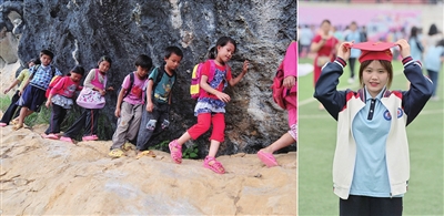 左图:2012年9月3日,在大化瑶族自治县板升乡弄雷村,8岁的蒙丽丹(右一)爬悬崖去学校读书;右图:2023年5月20日,蒙丽丹在广西大化瑶族自治县高级中学高三成人礼上。即将参加高考的蒙丽丹,希望以后能回到大山里当老师。