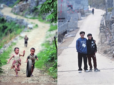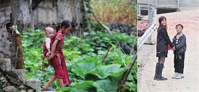 左图:2012年7月16日,在大化瑶族自治县板升乡弄勇村,4岁的蒙宣宏(左)穿着姐姐的旧衣服和同为4岁的蓝小帅在一起玩耍;右图:2023年1月21日,在大化瑶族自治县板升乡弄勇村,蒙宣宏(左)和蓝小帅合影。蒙宣宏和蓝小帅目前分别在板升乡和大化县城读初二。