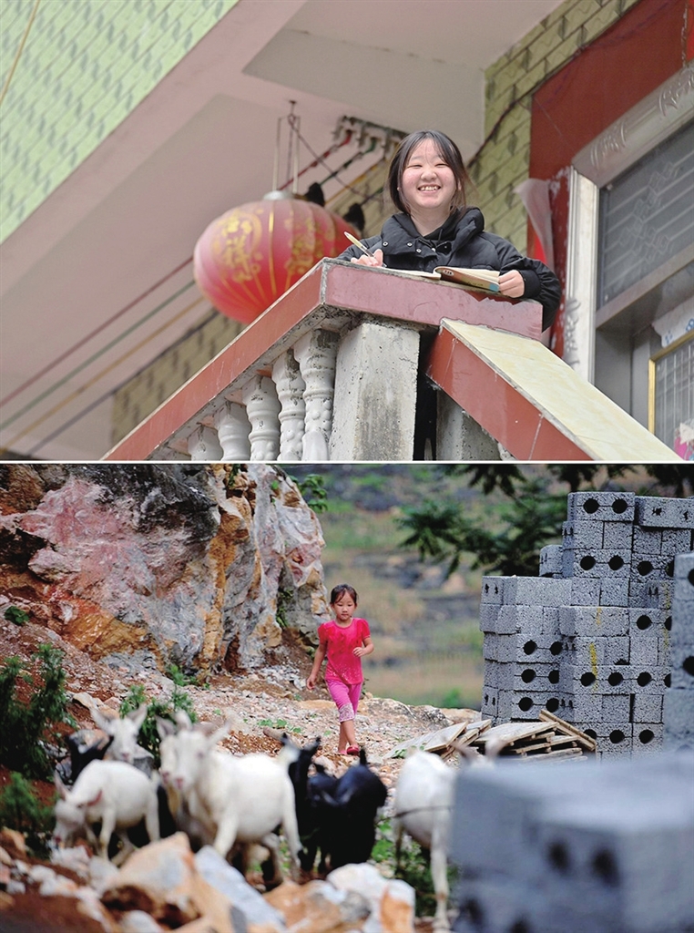 上图:2023年1月16日,在大化瑶族自治县板升乡弄勇村,正在读初中的蓝秀雪在家门口学习;16岁的蓝秀雪即将参加中考,希望能考上一所好高中。下图:2013年7月14日,5岁的蓝秀雪在放羊。