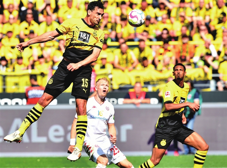 5月27日,多特蒙德队球员胡梅尔斯(上)在比赛中头球攻门。当日,在2022-2023赛季德国足球甲级联赛第34轮比赛中,多特蒙德队主场以2比2战平美因茨队,因净胜球的劣势不敌与多特蒙德队同积分的拜仁慕尼黑队,获得亚军。 新华社 发