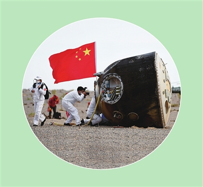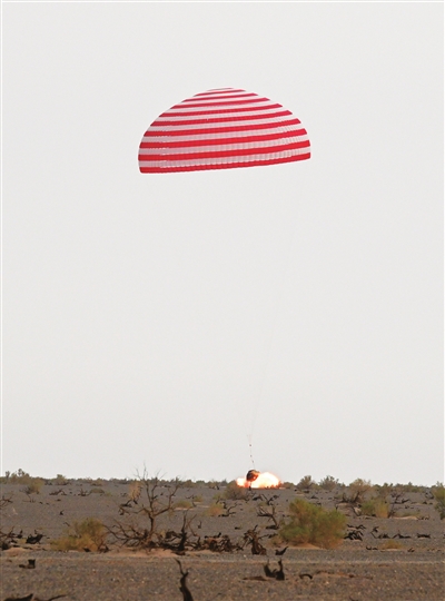突然间,一声雷鸣般的巨响穿透云层,整个戈壁滩沸腾了起来。“看见了!看见了!主降落伞打开啦!”有人高声喊道。仰望天空,只见红白相间的主降落伞挂着黑褐色的返回舱,正在缓缓降落。