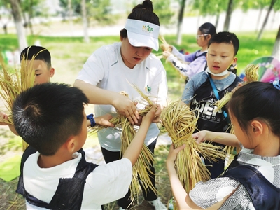 “芒种是一个种植农作物时机的分界点,由于已经进入典型的夏季,农事播种以这一时节为界,过了这一节气,农作物的成活率就越来越低。”在科普志愿者的讲解过程中,孩子们对芒种节气有了更深层次的认识。同时,志愿者带领亲子家庭通过五感体验,观察并认识到小麦成熟三个时期不同阶段的变化,学习麦株植物生长过程的科普知识,了解小麦的收割要求,体验了芒种的民俗文化。