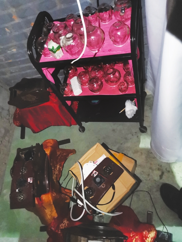 那么,受害人亲眼看到的从腋下拔出的脓液和体内排出的黑褐色液体是怎么回事呢?原来,在拔罐前,骗子会事先在火罐内放入姜汁和碘伏,而“肠排仪”洗出的黑褐色液体,则是骗子事先调制的咖啡。