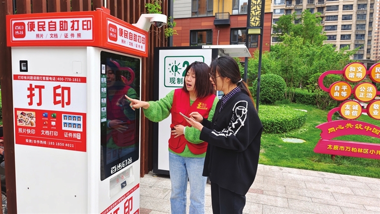 在蓝山社区,居民秦女士一天之内享受了三次自助服务。一大早,她晨练回来,来到小区的自助快递柜旁,输入取件码,拿走了头天晚上送来的快递包裹。上午,拾掇了家里的废纸板、饮料瓶,投进附近的智能垃圾分类回收箱里,显示屏显示她此次收益为5.3元。傍晚,下班回来,顺便找到楼下的自助打印机,扫码给孩子打印了两份试卷。她感觉,有了这些自助设施,随时能办不少事,方便多了。