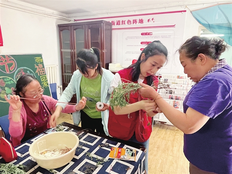 又是一年端午到,又是一年粽飘香。当天,解南二社区移动石油党支部活动室里欢声笑语,桌上摆着各种材料,等待居民用巧手创作不一样的作品。大家先用剪刀剪裁出五彩绳,细心编织,再缀上彩色小粽子挂饰,一条漂亮的端午节彩绳便完工了。阿姨们还分好艾草,用五彩绳一圈圈缠绕上去。随后,大家用彩笔在小葫芦上画出可爱、福气的图案。