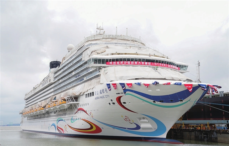 白色涂装、流线型船体、身系“敦煌飞天彩带”的首艘国产大型邮轮,取名为“爱达·魔都号”,寓意“从上海出发,爱达世界”。