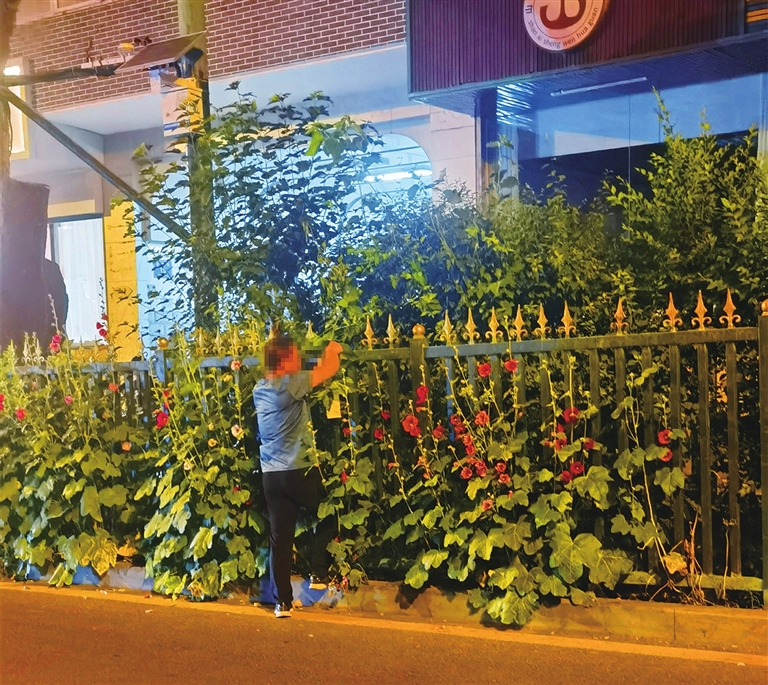 6月6日夜间皇华馆,一男子站在路边绿化带内,伸手将绿植叶子一片片摘下,不知何用。仔细观察,旁边一些花木,花被摘走,只剩花枝,此种行为实在不文明。申波 摄
