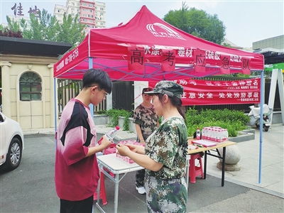 “放平心态,注意防暑,祝你取得理想的成绩!”“谢谢阿姨送的文具和矿泉水,我会努力的。”在小区门口,志愿者们以微笑和祝福,送高考生们一程。
