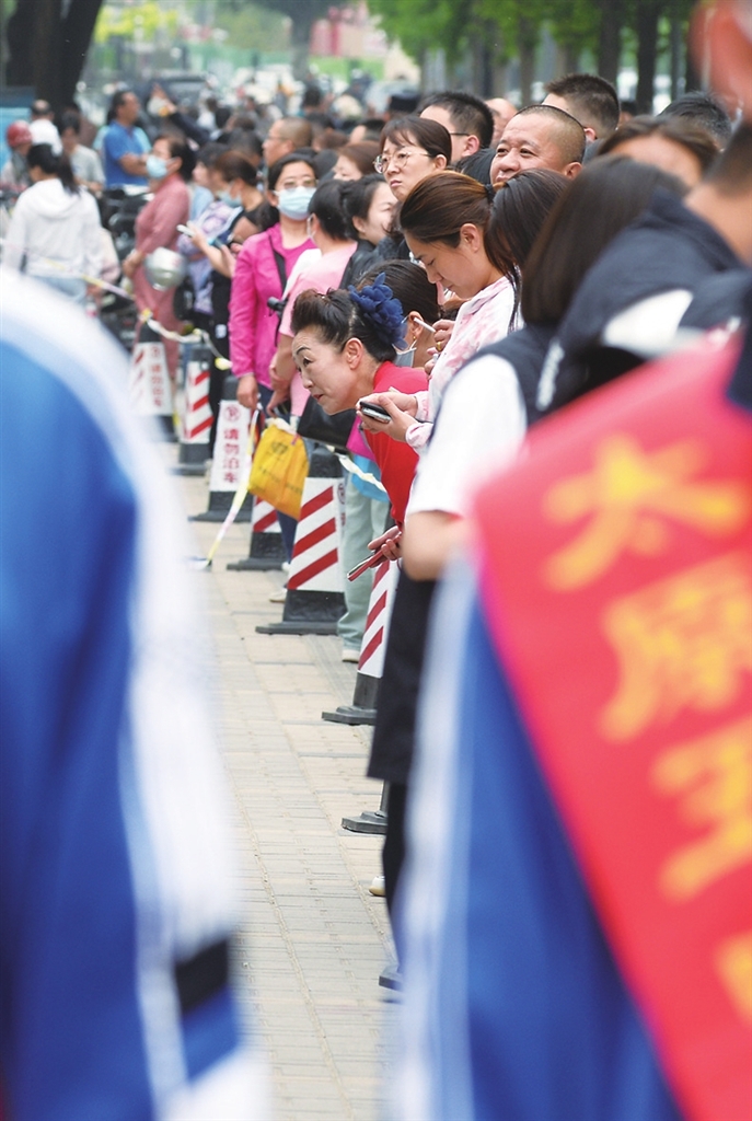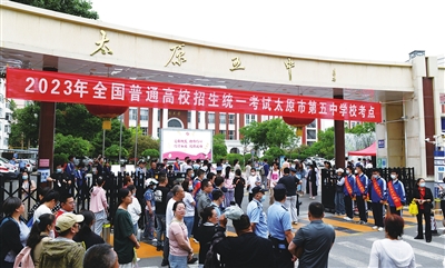 红色短袖、黑裤子,太原杏岭实验学校的十几位教师穿着统一服装来到考点为考生加油助威。“孩子进考场前,多少会紧张,我们和学生说说话、鼓鼓劲,他们会放松一些,希望他们用最好的状态迎接考试。”李老师和学生们挨个儿击掌,“我对孩子们非常有信心,祝他们考试成功,得偿所愿!”看着学生们陆续走入考点,教师们才踏实离开。