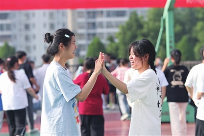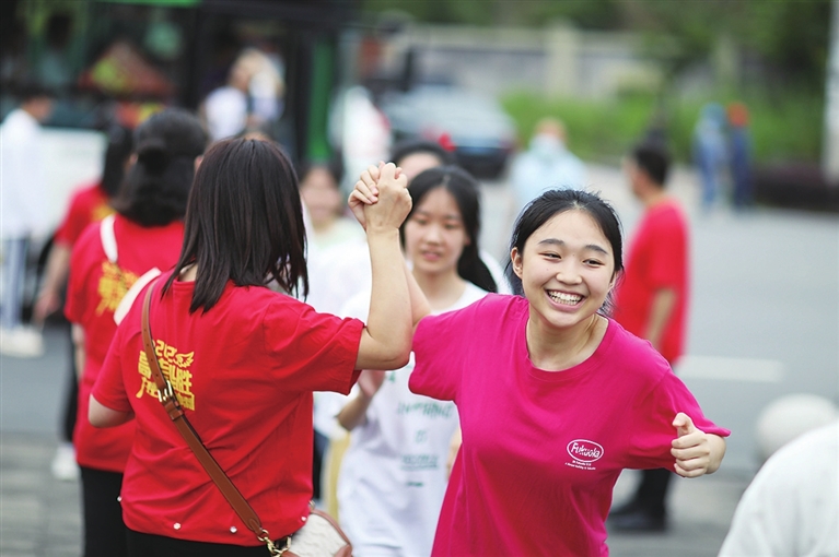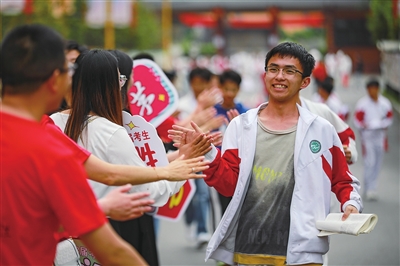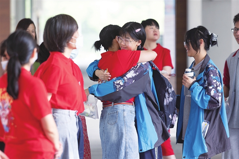 第一科语文考试结束后,沈阳市第五十一中学高三六班的张书博一出考场就跑向班主任张雨薇。“发挥出了最佳水平!”他激动地拥抱了张老师,自信的笑容感染了周围的家长和老师。