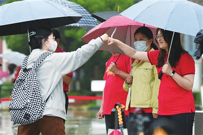 记者在贵阳市第六中学考点看到,多名老师手拿写着“沉着”“全力”“细心”等字样的标牌,给学生们鼓劲。在广州市天河中学考点,学校在入口处设置了遮阳遮雨棚,上面挂满学弟学妹们手写的祝福。