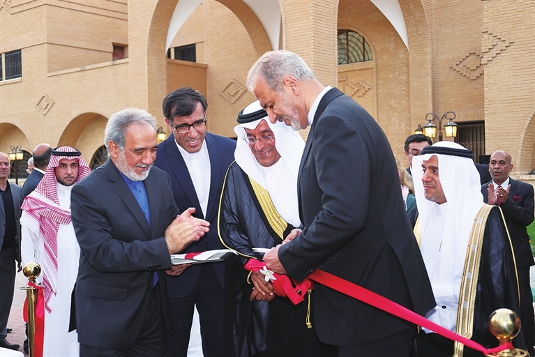 6月6日,在沙特阿拉伯利雅得,伊朗副外长比格德利(前)、沙特副外交大臣优素福(中)等出席伊朗驻沙特阿拉伯大使馆复馆仪式。