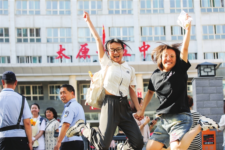 6月8日,太原市十五中考点,刚刚结束考试的两位同学欢快地雀跃,庆贺自己高考结束。 王韵菲 摄