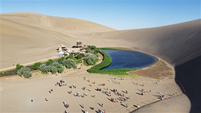 这是6月7日拍摄的甘肃敦煌鸣沙山月牙泉景区(无人机照片)。